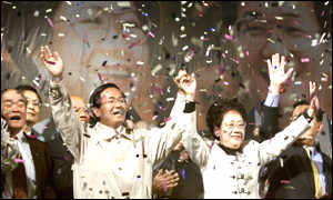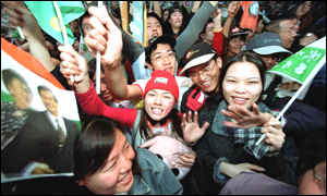 Sunday, 19 March, 2000, 01:19 GMT In Pictures: Taiwan election The presidential election in Taiwan has been won by Chen Shui-bian, the leader of an opposition party which supports independence for the island. During the election campaign, Beijing threatened military action if voters chose Mr Chen of the Democratic Progressive Party. ![]() Chen Shui-bian and his running mate Annette Lu celebrate ![]() Jubilation as more than 50 years of Nationalist Party rule ends | |