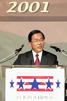 Affairs Stanley Roth of the Clinton Administration, left, is greeted by Taiwanese President Chen Shui-bian at the Presidential Building, Thursday, Feb. 15, 2001, in Taipei. Roth is visiting Taiwan scheduled to give lectures and is expected to stay throughout the weekend. (AP Photo/Presidential Office) |