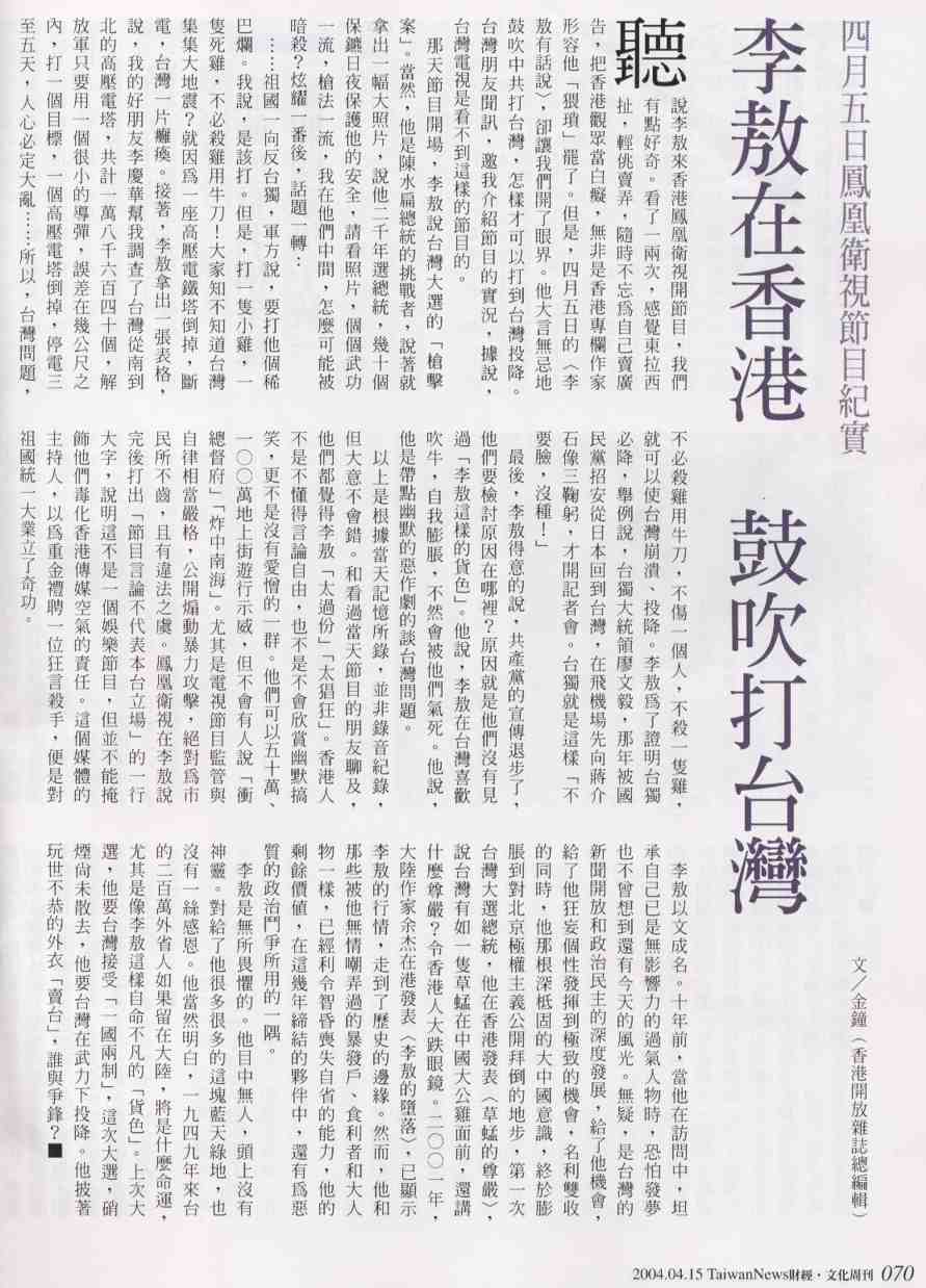 2004.4.15 Taiwan News 財經˙文化週刊070 文/金鐘(香港開放雜誌總編輯) 四月五日鳳凰衛視節目紀實 李敖在香港 鼓吹打台灣 聽說李敖來香港鳳凰為是開節目,我們有點好奇。看了一兩次,感覺東拉西扯,輕挑賣弄,隨時不忘為自己賣廣告,把香港觀眾當白痴,無非是香港專欄作家形容他「猥瑣」罷了。但是,四月五日的<李敖有話說>,卻讓我們開了眼界。他大言無忌地鼓吹中共打台灣,怎樣才可以打到台灣投降。台灣朋友聞訊,邀我介紹節目的實況,據說,台灣電視是看不到這樣的節目的。 那天節目開場,李敖說台灣大選的「槍擊案」。當然,他是陳水扁總統的挑戰者,說著就拿出一幅大照片,說他兩千年選總統,幾十個保鑣日夜保護他的安全,請看照片,個個武功一流,槍法一流,我在他們中間,怎麼可能被暗殺?炫燿一番後,話題一轉: ……祖國一向反台獨,軍方說,要打他個稀巴爛。我說,是該打。但是,打一隻小雞,一隻死雞,不必殺雞用牛刀!大家知不知道台灣集集大地震?就因為一座高壓電鐵塔倒掉,斷電,台灣一片癱瘓!接著,李敖拿出一章表格,說,我的好朋友李慶華幫我調查了台灣從南到北的高壓電塔,共計一萬八千六百四十個,解放軍只要小的導彈,誤差在幾公尺之內,打一個目標,一個高壓電塔倒掉,停電三至五天,人心必定大亂……所以,台灣問題,不必殺雞用牛刀,不傷一個人,不殺一隻雞,就可以使台灣崩潰、投降。李敖為了證明台獨必降,舉例說,台獨大統領廖文毅,那年被國民黨招安從日本回到台灣,在飛機場先向蔣介石像三鞠躬,才開記者會。台獨就是這樣「不要臉,沒種」。 最後,李敖得意的說,共產黨的宣傳退步了,他們要檢討原因在哪裡?原因就是他們沒有見過「李敖這樣的貨色」。他說,李敖在台灣喜歡吹牛,自我膨脹,不然會被他們氣死。他說,他是帶點幽默的惡作劇的談台灣問題。 以上是根據當天記憶所錄,並非語音紀錄,但大意不會錯。 (下略) ------------------ 以上是小弟手打可能有錯字請見諒 陳文茜上週末去香港ㄟ 該不會是去看李敖大哥ㄅ 看「李敖這樣的貨色」能不能引薦她到共產黨中央作文宣 嗯 本人舉雙手贊成 |