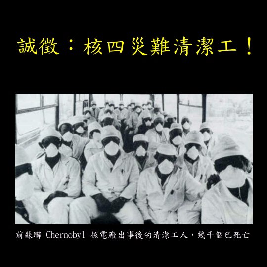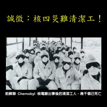 Charlie: I've no idea who took the photo, but you might find the info by searching the above site. And please help to spread the job request to the non-believers! 台灣人因為長期過著沒有未來的生活,至今仍有不少人日子過一天算一天,不願意去思考到底以後該怎麼辦較好─「隨人顧性命」! "THE LIQUIDATORS are those people who were recruited or forced to assist in the cleanup or the "liquidation" of the consequences of the accident. As a totalitarian government the Soviet Union forced many young soldiers to assist in the cleanup of the Chornobyl accident, apparently without sufficient protective clothing and insufficient explanation of the danger involved. Over 650,000 liquidators helped in the cleanup of the Chornobyl disaster in the first year. Many of those who worked as LIQUIDATORS became ill and according to some estimates about 8,000 to 10,000 have died from the radioactive dose they received at the Chornobyl Power Plant. This group apparently includes those who built the containment building over the destroyed reactor No. 4 which is called the SARCOPHAGUS. " | |