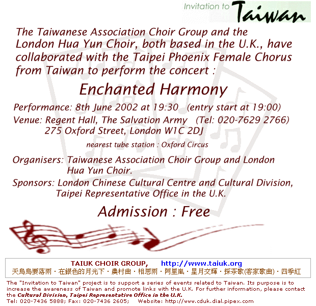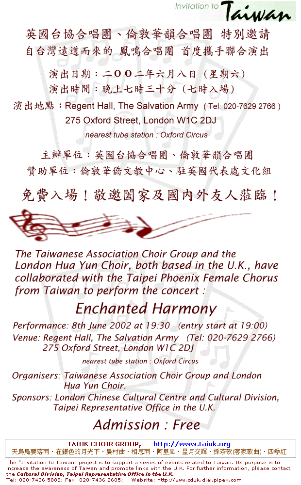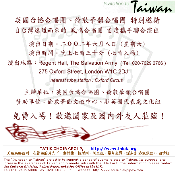 英國台協合唱團、倫敦華韻合唱團 特別邀請 自台灣遠道而來的鳳鳴合唱團首度攜手聯合演出 演出日期:二○○二年六月八日 (星期六) 演出時間:晚上七時三十分 (七時入場) 演出地點: Regent Hall, The Salvation Army (Tel: 020-7629 2766) 275 Oxford Street, London W1C 2DJ nearest tube station: Oxford Circus 主辦單位:英國台協合唱團、倫敦華韻合唱團 贊助單位:倫敦華僑文教中心、駐英國代表處文化組 免費入場!敬邀闔家及國內外友人蒞臨! ======================== 英國台協合唱團(表演曲目), http://www.taiuk.org .天烏烏要落雨.在銀色的月光下.農村曲.相思雨. .阿里嵐.星月交輝.採茶歌(客家歌曲).四季紅. ======================== 英國∼台灣.三大合唱團聯合演唱會,相關資料下載: HTML 文件檔案 .gif 海報圖形檔案(漢字) .gif 海報圖形檔案(英文) .gif 海報圖形檔案(漢字+英文) .chm (Windows HTML Help)文件檔案 .pdf 文件檔案 |