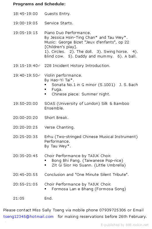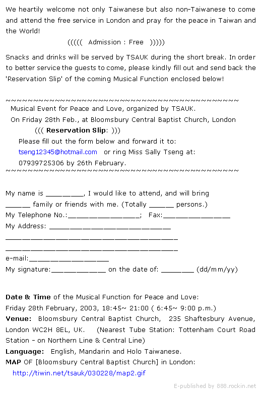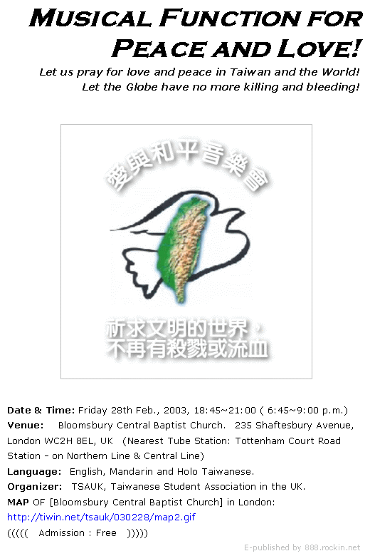 Taiwanese_Newsletter_UK, 24th-Feb-2003 _______________________________________________________________ -.-.-.-.-.-.-.-.-.-.-.-.-.-.-.-.-.-.-.-.-.-.-.-.-.-.-.-.-.-.-.- ...................... PEACE AND LOVE ...................... Dear Friends: Here weve got the following info for you in this issue! 1. ``Musical Function for Peace and Love!`` organised by TSAUK! -- scheduled on Friday 28th Feb. starting at 18:45 (6:45pm) ,at Bloomsbury Central Baptist Church in Central London. 2. Programs and Schedule of the TSAUKs Musical Function. 3. ((( Reservation Slip! ))) of the TSAUKs Musical Event. 4. Brief introduction to the musicians/ performers. 5. Web resources for downloading the info pack of the ``Musical Function for Peace and Love!``. Please refer to the details listed as follows: ~~~~~~~~~~~~~~~~~~~~~~~~~~~~~~~~~~~~~~~~~~~~~~~~~~~~~~~ Musical Function for Peace and Love! Lets pray for love and peace in Taiwan and the World! Let the Globe have no more killing and bleeding! ~~~~~~~~~~~~~~~~~~~~~~~~~~~~~~~~~~~~~~~~~~~~~~~~~~~~~~~ Date and Time: Friday 28th Feb., 2003, 18:45 ~ 21:00 ( 6:45 ~ 9:00 p.m.) Venue: Bloomsbury Central Baptist Church. 235 Shaftesbury Avenue, London WC2H 8EL, UK (Nearest Tube Station: Tottenham Court Road Station - on Northern Line & Central Line) Language: English mainly, plus Mandarin and Holo Taiwanese. Organizer: TSAUK, Taiwanese Student Association in the UK. http://www.tsauk.org MAP OF [Bloomsbury Central Baptist Church] in London: http://tiwin.net/tsauk/030228/map2.gif ((((( Admission : Free ))))) ~~~~~~~~~~~~~~~~~~~~~~~~~~~~~~~~~~~~~~~~~~~~~~~~~~~~~~~ Programmes and Schedule of the Musical Function for Peace and Love! Lets pray for love and peace in Taiwan and the World! Let the Globe have no more killing and bleeding! ~~~~~~~~~~~~~~~~~~~~~~~~~~~~~~~~~~~~~~~~~~~~~~~~~~~~~~~ 18:45-19:00 Guests Entry. 19:00-19:05 Service Starts. 19:05-19:15 Piano Duo Performance. By Jessica Hsin-Ting Chan* and Tau Wey*. Music: George Bizet Jeux denfants, op 22 [Childrens play] 1). Circles. 2). The doll. 3). Swing horse. 4). Blind cow. 5). Daddy and mummy. 6). A ball. 19:15-19:40 228 Incident History Introduction. 19:40-19:50 Violin performance. By Hao-Yi Tai*. . Sonata No.1 in G minor (S.1001) J. S. Bach . Fuga. . Chinese piece: Summer night. 19:50-20:00 SOAS (University of London) Silk & Bamboo Ensemble. 20:00-20:20 Short Break. 20:20-20:25 Verse Chanting. 20:25-20:35 Erhu (Two-stringed Chinese Musical Instrument) Performance. By Tau Wey*. 20:35-20:45 Choir Performance by TAIUK Choir. . Bong Bhi Pang. (Taiwanese Pop-rice) . Zit Gi Sior Ho Suann. (Little Umbrella) 20:45-20:55 Conclusion and One Minute Silent Tribute. 20:55-21:05 Choir Performance by TAIUK Choir. . Formosa Lan e Bhang (Formosa Song) 21:05 End. We heartily welcome not only Taiwanese but also non-Taiwanese to come and attend the free service in London and pray for the peace in Taiwan and the World! ((((( Admission : Free ))))) Snacks and drinks will be served by TSAUK during the short break. In order to better service the guests to come, please kindly fill out and send back the Reservation Slip of the coming Musical Function enclosed below! Please contact Miss Sally Tseng via mobile phone 07939725306 or Email [email protected] for making reservations as soon as possible. ~~~~~~~~~~~~~~~~~~~~~~~~~~~~~~~~~~~~~~~~~~~~~~~~~~~~~~~ ((( Reservation Slip! ))) of Musical Function for Peace and Love! Lets pray for love and peace in Taiwan and the World! Let the Globe have no more killing and bleeding! ~~~~~~~~~~~~~~~~~~~~~~~~~~~~~~~~~~~~~~~~~~~~~~~~~~~~~~~ Please fill out the form below and forward it to: [email protected] or ring Miss Sally Tseng at: 07939725306 by 27th February. My name is _________, I would like to attend, and will bring ______ family or friends with me. (Totally ______ persons.) My Telephone No.:_________________; Fax:________________ My Address: _____________________________ _________________________________________ _________________________________________ e-mail:___________________ My signature:_____________ on the date of: ________ (dd/mm/yy) Date & Time of the Musical Function for Peace and Love: Friday 28th February, 2003, 18:45~ 21:00 ( 6:45~ 9:00 p.m.) Venue: Bloomsbury Central Baptist Church, 235 Shaftesbury Avenue, London WC2H 8EL, UK. (Nearest Tube Station: Tottenham Court Road Station - on Northern Line & Central Line) Language: English mainly, plus Mandarin and Holo Taiwanese. MAP OF [Bloomsbury Central Baptist Church] in London: http://tiwin.net/tsauk/030228/map2.gif |
