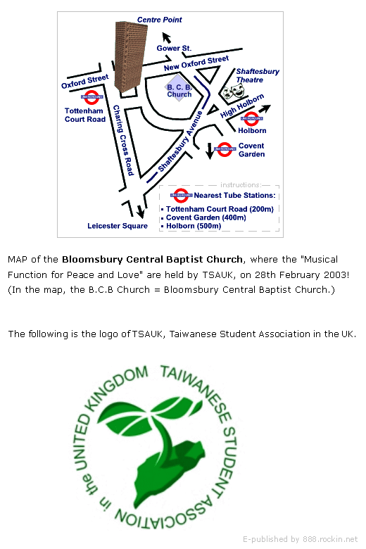 ~~~~~~~~~~~~~~~~~~~~~~~~~~~~~~~~~~~~~~~~~~~~~~~~~~~~~~~ Web Resources of the news release: Musical Function for Peace and Love! Lets pray for love and peace in Taiwan and the World! Let the Globe have no more killing and bleeding! ~~~~~~~~~~~~~~~~~~~~~~~~~~~~~~~~~~~~~~~~~~~~~~~~~~~~~~~ Info Pack Download Area: http://tiwin.net/tsauk/030228/poster1~5.shtml or http://tiwin.net/tsauk/030228/poster1of5.shtml HTML with Document content in IMAGE Format.-Readable worldwide! http://tiwin.net/tsauk/030228/poster1of5main.gif http://tiwin.net/tsauk/030228/poster2of5programme.gif http://tiwin.net/tsauk/030228/poster3of5reservation.gif http://tiwin.net/tsauk/030228/poster4of5map.gif http://tiwin.net/tsauk/030228/poster5of5appendix.gif Document in IMAGE Format. - Readable worldwide! Please save and help us to circulate these image files via emails. Cheers! http://tiwin.net/tsauk/030228/posters123.pdf http://tiwin.net/tsauk/030228/posters1234.pdf Adobe Acrobat Portable Document Format. (*.pdf) - Need Adobe Reader, which is a downloadable freeware at: http://www.adobe.com/products/acrobat/readstep2.html http://tiwin.net/tsauk/030228/poster1~5.exe E-Book with IMAGE Format. ( *.exe ) - Readable worldwide! http://tiwin.net/tsauk/030228/posters1234.doc Microsoft Word Format, in Mandarin Big5 encoding. ( *.doc ) http://tiwin.net/tsauk/030228/poster1~5.chm Microsoft HTML Help Format. ( *.chm ) - Readable worldwide if you use Microsoft Windows 98/ME/2000/XP! http://tiwin.net/tsauk/030228/map2.gif Map of Bloomsbury Central Baptist Church (London), in IMAGE format. ( *.gif ) - Readable worldwide. http://www.tsauk.org (TSAUK website, in English / Mandarin.) Please visit TSAUK.ORG for newest Press Release! http://forum.tsauk.org TSAUK Forum, in Mandarin mainly. http://tiwin.net/twaukinfo TWAUK Info Board, in English / Mandarin. http://tiwin.net/taiukinfo TAIUK Info Board, in English / Mandarin. http://888.rockin.net/loncamox (in English/ Mandarin.) http://888.rockin.net/taiwan168 (in Mandarin.) Hope the above hor-kang goodies help~~ see you next time, have a nice day! :o) regards, Charles at TNUK Team --- You are more than welcome to recommend your friends to join this newsletter through visiting the following websites: http://groups.yahoo.com/group/Taiwanese_Newsletter_UK or http://888.rockin.net/tnuk or Contact via form mail: http://charlie-chuck-chuck.com/contact/charles.shtml with the line Subscribe TNUK filled in the Subject field! _______________________________________________________________ -.-.-.-.-.-.-.-.-.-.-.-.-.-.-.-.-.-.-.-.-.-.-.-.-.-.-.-.-.-.-.- |