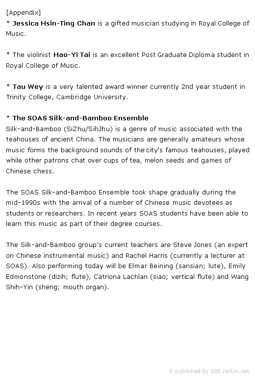 各位親愛的旅英地區僑學工商各界人士們: 英國台灣同學會將於二月二十八日(週五)假 倫敦 Bloomsbury Central Baptist Church 舉行 ◆◆◆◆◆◆◆◆◆◆◆◆◆◆◆◆◆◆◆◆◆◆ ◆ ◆ ◆ ◆ ◆ 愛與和平音樂會 ◆ ◆ ◆ ◆ ∼祈求文明的世界,不再有殺戮或流血! ◆ ◆ ◆ ◆ ◆ ◆◆◆◆◆◆◆◆◆◆◆◆◆◆◆◆◆◆◆◆◆◆ 此次「愛與和平音樂會」由數位優秀的旅英同學帶來 優美的鋼琴以及小提琴演奏,還有倫大亞非學院的「 絲竹合奏樂團」(Silk-and-Bamboo Ensemble),有 關演說部分將配合多數人士的需求以英文ˋ福佬台語 ˋ國語進行,歡迎旅英的各界人士及同學踴躍參加, 一起為台灣的和平祈福! 活動簡介如下: 活動日期:2003年 2月 28日(週五) 〔免費入場,敬請預先註冊劃位〕 活動內容: 18:45 - 19:00 入場 19:00 - 19:05 開幕儀式 19:05 - 19:15 鋼琴演奏(詹昕庭、魏子韜) 19:15 - 19:40 歷史介紹 19:40 - 19:50 小提琴演奏(戴豪逸) 19:50 - 20:00 倫大亞非學院的絲竹合奏樂團 20:00 - 20:20 中場休息 20:20 - 20:25 吟詩(林奇梅) 20:25 - 20:35 二胡表演(魏子韜) 20:35 - 20:45 台協合唱團(Bong米香、一支小雨傘) 20:45 - 20:55 總結及默哀 20:55 - 21:05 台協合唱團(福爾摩莎頌) 21:05 結束 活動地點: Bloomsbury Central Baptist Church 235 Shaftesbury Avenue, London WC2H 8EL UK 地圖: http://tiwin.net/tsauk/030228/map2.gif 最近地鐵站: Tottenham Court Road Station - on Northern Line & Central Line. 主辦單位: 英國台灣同學會 http://www.tsauk.org ((((( Admission : Free ))))) ∼∼∼∼∼∼∼∼∼∼∼∼∼∼∼∼∼∼∼∼∼∼∼ 愛與和平音樂會 〔參加回條〕 姓名:ˍˍˍˍˍˍˍˍ願參加本次活動, 並將攜ˍˍˍ位眷屬/朋友參加; 共計:ˍˍˍ位參加本次活動。 聯絡電話:ˍˍˍˍˍˍˍˍˍˍˍ 聯絡地址:ˍˍˍˍˍˍˍˍˍˍˍˍˍˍˍˍ ˍˍˍˍˍˍˍˍˍˍˍˍˍˍˍˍˍˍˍˍˍ ˍˍˍˍˍˍˍˍˍˍˍˍˍˍˍˍˍˍˍˍˍ E-mail:ˍˍˍˍˍˍˍˍˍˍˍ 報名人簽名:ˍˍˍˍˍˍˍˍˍ; 日期:ˍˍˍˍ年ˍˍ月ˍˍ日 煩請填妥參加回條後,電洽或e-mail 曾珣瑄小姐(聯絡電話:07939725306; E-Mail: [email protected] ) ∼∼∼∼∼∼∼∼∼∼∼∼∼∼∼∼∼∼∼∼∼∼∼ 表演者簡介: ◆ 詹昕庭:英國皇家音樂學院高材生 ◆ 魏子韜:英國劍橋大學三一學院高材生 ◆ 戴豪逸:英國皇家音樂學院高材生 ◆ 英國台協合唱團:在地台灣人著名合唱團 ◆ 倫敦大學亞非學院絲竹樂團 SOAS Silk & Bamboo Ensemble 絲竹合奏樂團(Silk-and-Bamboo Ensemble)的音樂性 質讓人置身於古早茶樓裡。大致上而言,古時候,音樂 家都是在城市中有名的茶樓擔任業餘演奏家,用其優美 的音樂組成了茶樓的主要背景聲音伴隨著顧客的談笑聲 ,瓜子聲以及下象棋的聲音。 SOAS絲竹合奏樂團,是由一群熱愛著中國音樂的學 生及研究者於1990年代中期慢慢成形。近幾年來, SOAS學生己經能夠將此音樂當作是他們部份的學位 課程。 絲竹樂團的現任指導老師為史帝文.瓊斯(Steve Jones 中國樂器演奏學家)以及瑞琪兒.哈利斯(Rachel Harris, SOAS 現任講師)。 另外,此次的演出者是: 三弦 (sansian, lute): 艾瑪.班寧 Elmar Beining 笛 (dizih, flute): 愛蜜麗.愛蒙斯頓 Emily Edmonstone, 蕭 (siao, vertical flute): 卡崔歐娜.蕾克蘭 Catriona Lachlan 笙 (sheng, mouth organ): 王詩音 Wang Shih-Yin 敬請大家告訴大家,歡迎結伴踴躍出席! 英國臺灣同學會(TSAUK)敬上 2003年 1月 25日 http://www.tsauk.org |