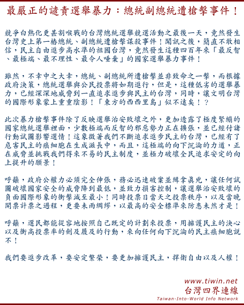 最嚴正的譴責選舉暴力: 總統副總統遭槍擊事件! 競爭白熱化更甚割喉戰的台灣總統選舉競選活動之最後一天,竟然發生 台灣史上第一樁總統、副總統遭槍擊謀殺事件!聞訊之後,簡直不敢相 信,民主自由進步高水準的祖國台灣,竟然發生這種四百年來「最反智 、最極端、最不理性、最令人唾棄」的國家選舉暴力事件! 雖然,不幸中之大幸,總統、副總統所遭槍擊並非致命之一擊,而根據 政府決策,總統選舉與公民投票將如期進行,但是,這種低劣的選舉暴 力,已經深深地威脅到一直追求進步與民主的台灣,同時,讓文明台灣 的國際形象蒙上重重陰影!「東方的西西里島」似不遠矣!? 此次暴力槍擊事件除了反映選舉治安敗壞之外,更加透露了極度緊繃的 國家總統選舉裡面,少數極端而反智的邪惡勢力正在擴張,並已經付諸 行動試圖影響選情!這象徵著我們不斷追求進步民主的台灣,已經有了 危害民主的癌細胞在生成滋長中,而且,這極端的向下沉淪的力道,正 在威脅並挑戰我們得來不易的民主制度,並極力破壞全民追求安定的向 上提升的願景! 呼籲,政府公權力必須完全伸張,務必迅速破案並緝拿真兇,讓任何試 圖破壞國家安全的威脅降到最低,並致力損害控制,讓選舉治安敗壞的 負面國際形象的衝擊減至最小!同時投票日當天之投票秩序,以及當晚 開票計票之過程,更要未雨綢繆,以最高的安全標準來防患未然才是! 呼籲,選民都能從容地按照自己既定的計劃來投票,用擁護民主的決心 以及衝高投票率的劍及履及的行動,來向任何向下沉淪的民主癌細胞說 不! 我們要進步改革,要安定繁榮,要更加擁護民主,捍衛自由以及人權! www.tiwin.net 台灣四界連線 src=http://www.tiwin.net/images/tiwinnet3_015sec.gif border=0 width=88 height=32 alt=http://www.tiwin.net> -.-.-.-.-.-.-.-.-.-.-.-.-.-.-.- 相關新聞: Taiwans President Shot at Rally, BBC Taiwans President Chen Shot, CNN 總統車隊台南掃街 傳出意外, Yam News 最嚴正的譴責選舉暴力:總統副總統遭槍擊事件!(圖形檔) |